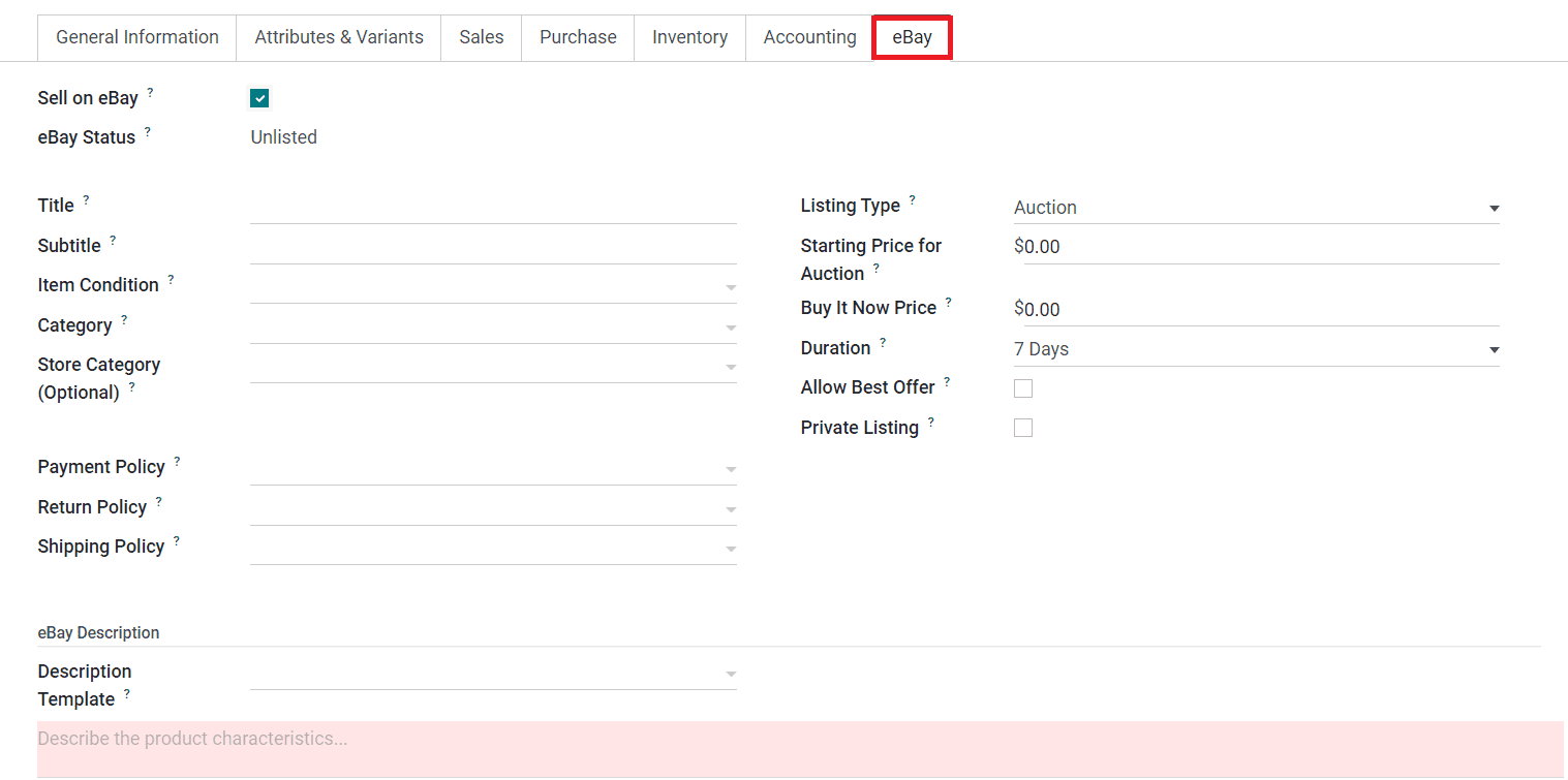 You will be able to get the eBay Status of the product in this tab. In the respective fields, you can mention the Title, Subtitle, Item Condition, Category, Store Category, Listing Type, Starting Price for Auction, Buy it Now Price, Duration, Allow Best Offer, and Private Listing. The policies related to eBay selling of the product such as the Payment Policy, Return Policy, and Shipping Policy can be defined in the given fields. Under the eBay Description tab, you can add a Description Template related to the characteristics of the product.