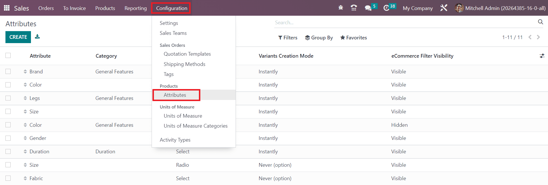 A list view of the Attributes will appear on your screen with the details of the Attribute, Category, Display Type, Variants Creation Mode, and eCommerce Filter Visibility. Use the Create button to add a new attribute to your system. as Instantly, Dynamically, or Never. By selecting the Instantly option, all possible variants will be created as soon as the attribute and its values are added to a product. The variants will be created only when their corresponding attributes and values are added to a sales order by selecting the Dynamically option. Variants are never created for the attributes by choosing the Never option in the Variants Creation Mode.