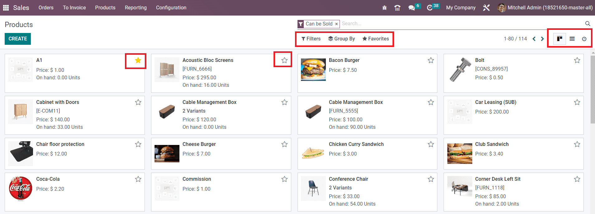 Just like we observed in the CRM module, the icon that represents the Kanban view has changed in Odoo 16. Apart from the kanban and list views, you will get an additional view on this platform which is Activity which will show the list of activities scheduled for different sales-related operations for different products. Regardless to say, the Filters and Group By options are available in this window also to simplify the sorting process. Customizable options are available in both sorting options so that you can easily retrieve the required data within seconds. You will get a star icon on each product which can be used to add a product to your favorite list.