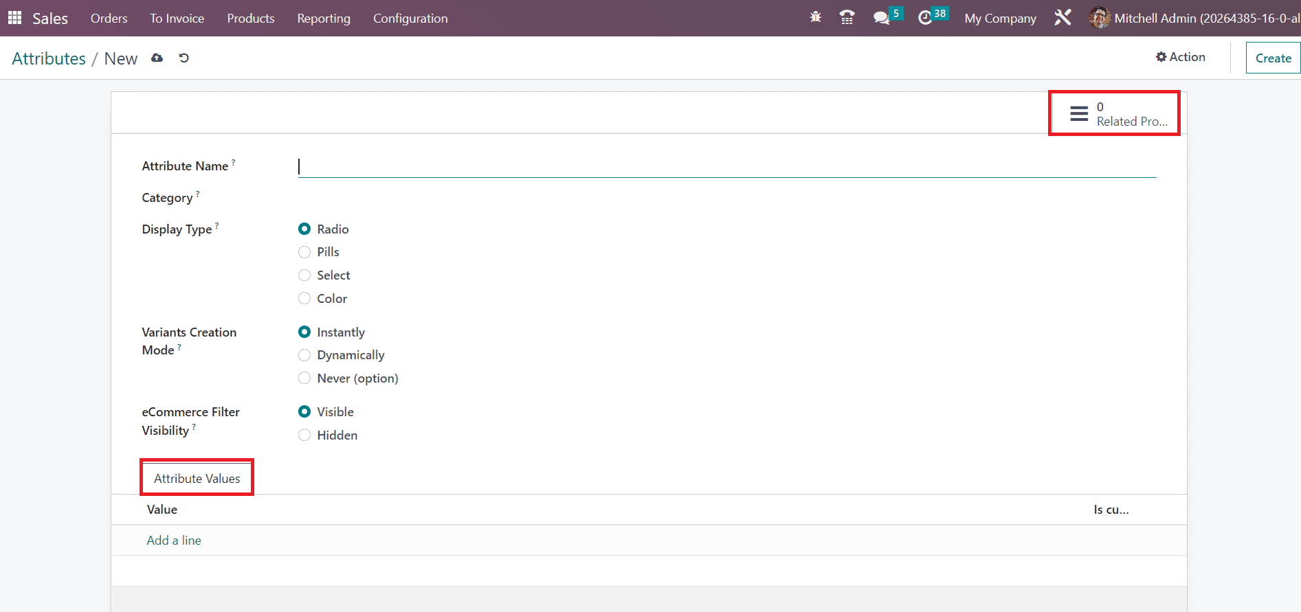 The attribute will be available in the ecommerce filter by selecting the Visible option from the eCommerce Filter Visibility field. You can hide this attribute from the filter in the website by selecting the Hidden option. Under the Attribute Values tab, you can mention the Values of the attribute one by one using the Add a Line button. The smart button Related Products will show the list of products with this attribute.