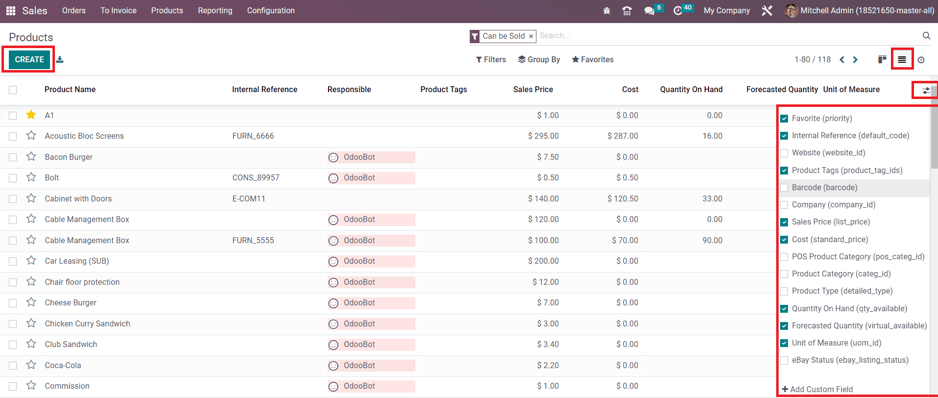 The List view of the product window displays the details of the Product Name, Internal Reference, Responsible, Product Tags, Sales Price, Cost, Quantity on Hand, Forecasted Quantity, and Unit of Measure. You can add additional default fields as well as custom fields to the list view using the icon given on the right corner of the window as marked in the screenshot below.