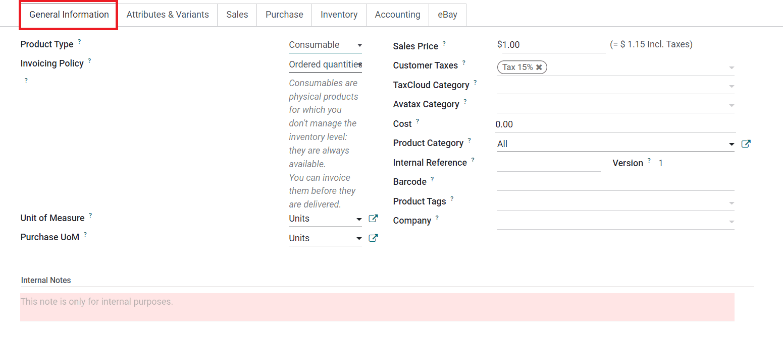 In the corresponding fields, you can specify the Cost, Product Category, Internal Reference, Barcode, Product Tags, and Company. The Internal Notes available in the General Information tab can be used to add notes for internal purposes.
