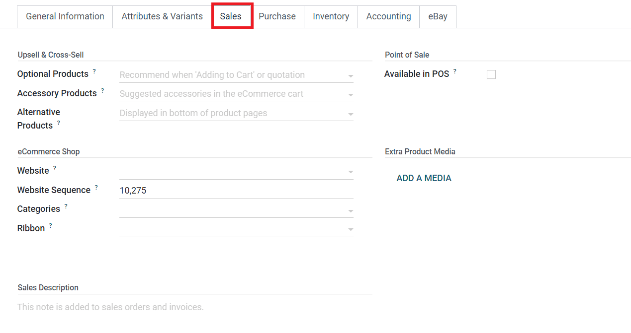 Under the Commerce Shop field, you can specify the details regarding your eCommerce website to publish the product for online sales. The Website Sequence will determine the display order on the eCommerce page. The Categories field can be used to mention the eCommerce category of the product. While publishing a product on an eCommerce page, you can add ribbons on them like New, Out of Stock, Limited Stock, etc to attract customers. Such ribbons can be mentioned in the Ribbons field. If you want this product to appear at the point of sale, you are allowed to enable the Available in POS POS option given under the Point of Sale field. Using the Add a Media button, you can upload Extra Product Media related to the product.
