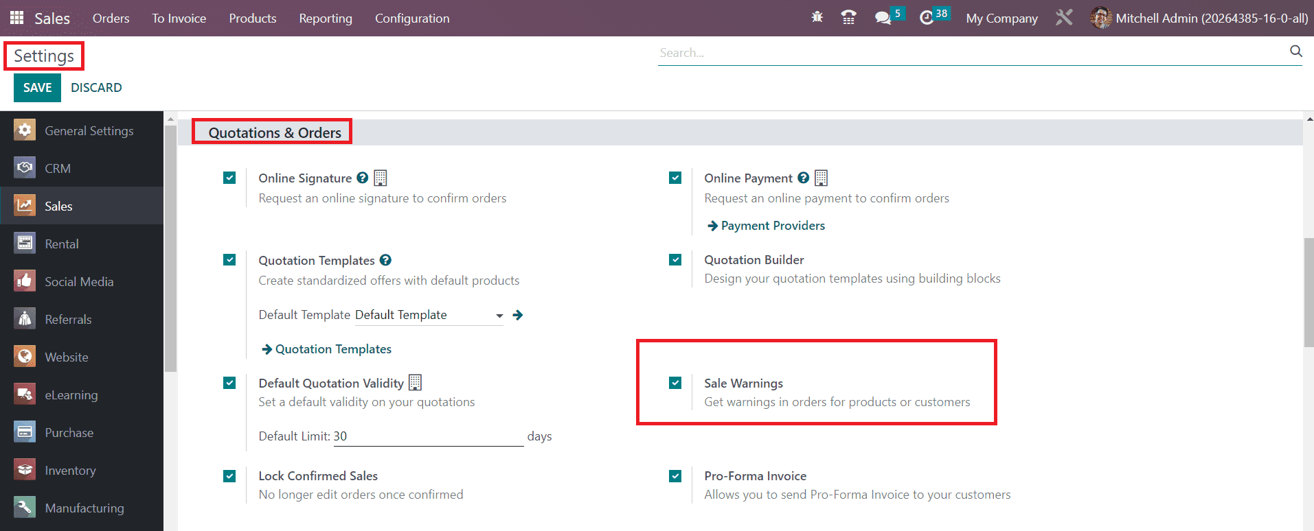Here, Odoo offers you an option to generate warning messages on products. You can activate this feature from the Settings menu of the Sales module. Using this feature, you can set warnings and block messages on a product.