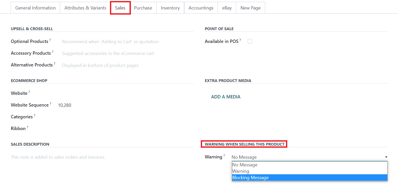The sales-related details of the new product will be recorded under the Sales tab of the product configuration window. You can use this tab to define your upselling and cross-selling strategies, eCommerce shop, and point of sale. The screenshot depicted below shows the Sales tab of a product. Under the Upsell & Cross-Sell field, you can define the Optional Products, Accessory Products, and Alternative Products in the respective spaces.